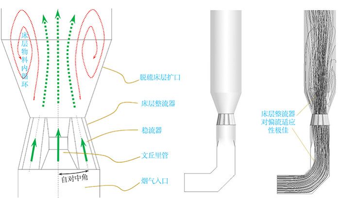 文丘里装置是半干法循环硫化床脱硫塔中常用也是关键的结构件。烟气从脱硫塔底部进入,然后经过文丘里装置对气流进行提速加强气流刚度,目的是使得进入脱硫塔床层的气流能够成功托起床层物料,并形成物料的湍流涌动状态。好的文丘里气流流场组织形态是泉涌状,即,中心气流柱较强,床层物料随中心气流上升,在脱硫塔主体区域烟气流速降低,物料也在塔壁区域回流,形成“环核流动”状态,物料形成内循环,与烟气中的硫化物进行反应,降低烟气硫含量,起到有效脱硫的目的。